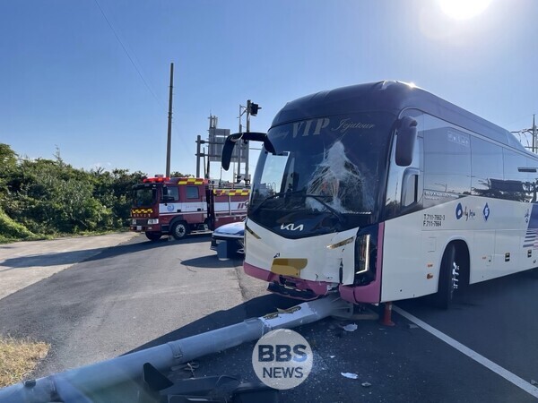 제주특별자치도 소방안전본부에 따르면 오늘(24일) 오전 8시50분쯤 서귀포시 안덕면 서광리의 한 교차로에서 수학여행단을 태운 전세버스가 도로 이정표를 들이받는 사고가 발생했습니다.